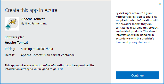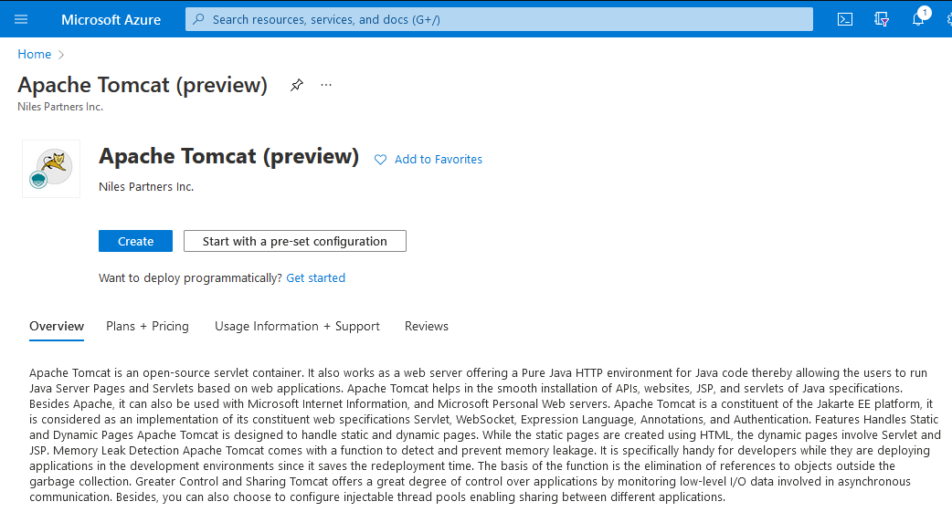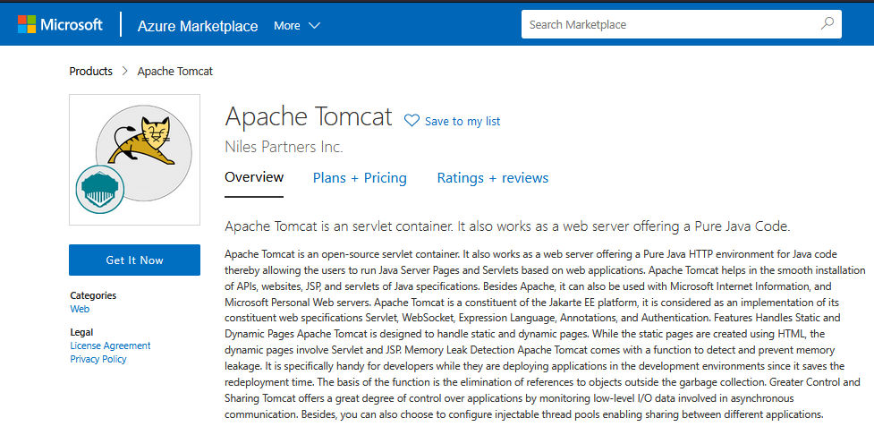 Step 1: Access Apache Tomcat in Azure Marketplace and click on get it now button.
