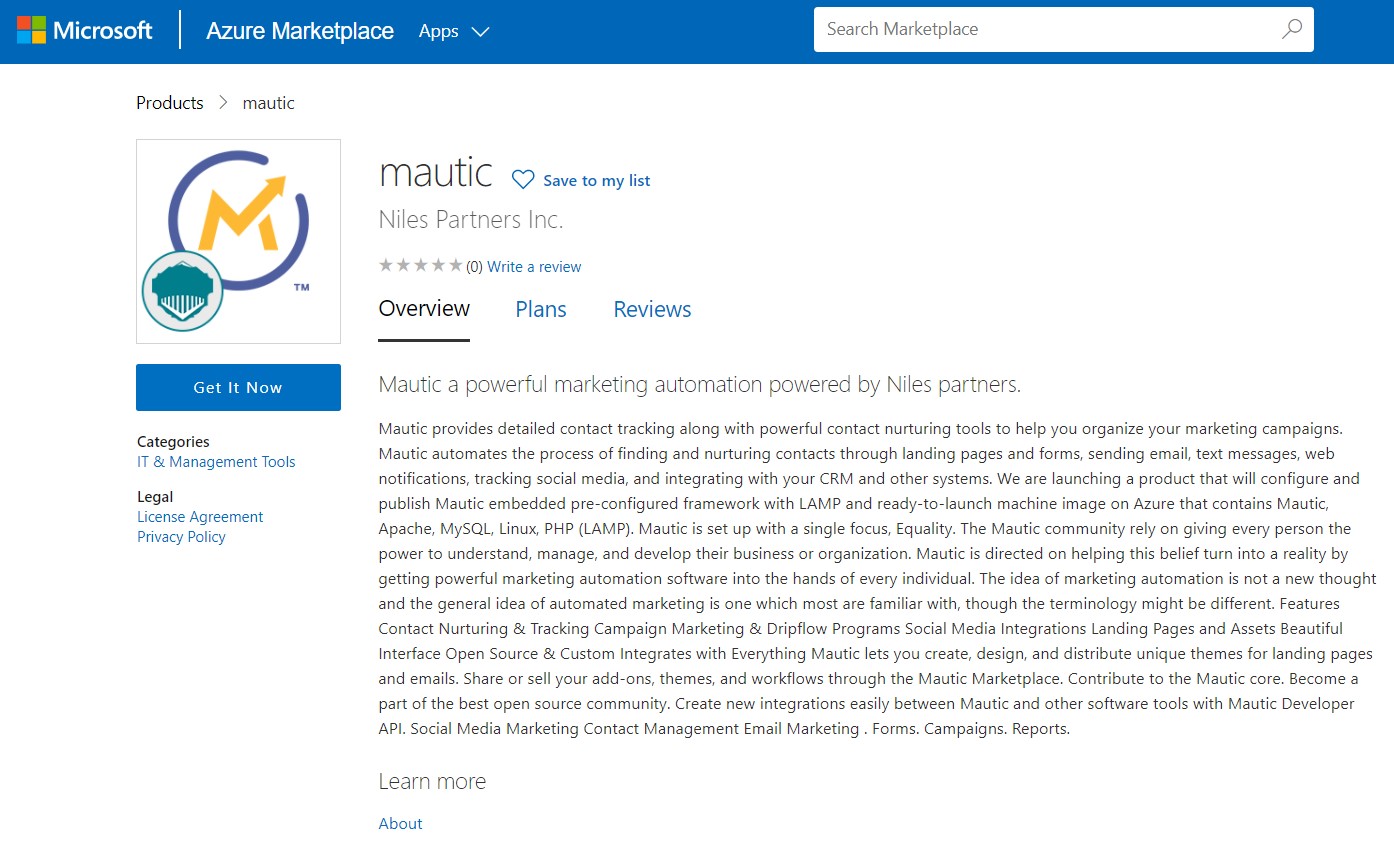 An Azure product Mautic : a powerful marketing automation powered by Niles partner. Mautic provides detailed contact tracking along with powerful contact nurturing tools to help you organize your marketing campaigns. Mautic automates the process of finding and nurturing contacts through landing pages and forms, sending email, text messages, web notifications, tracking social media, and integrating with your CRM and other systems.