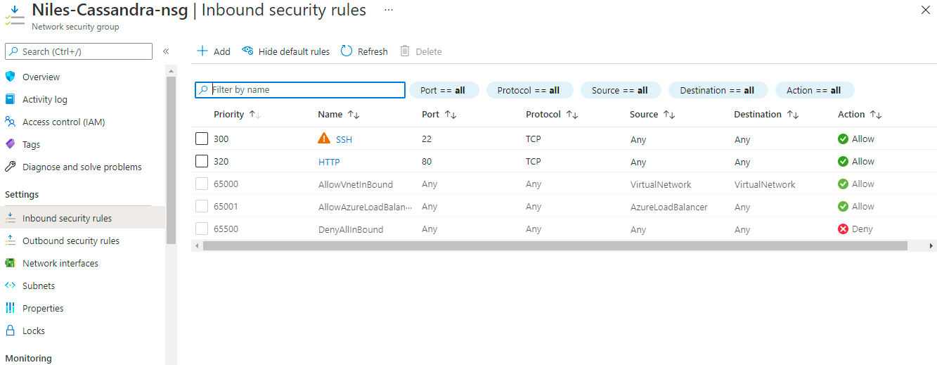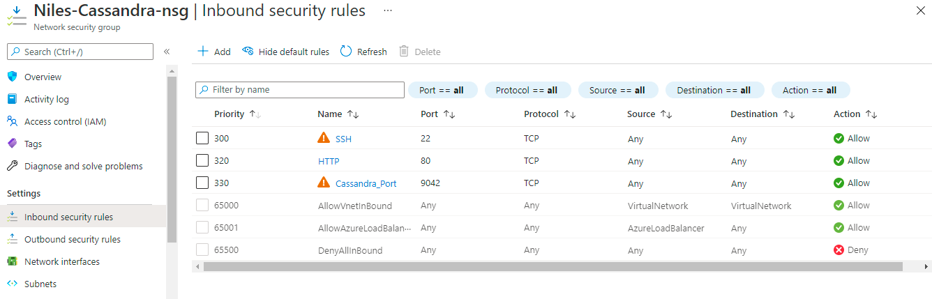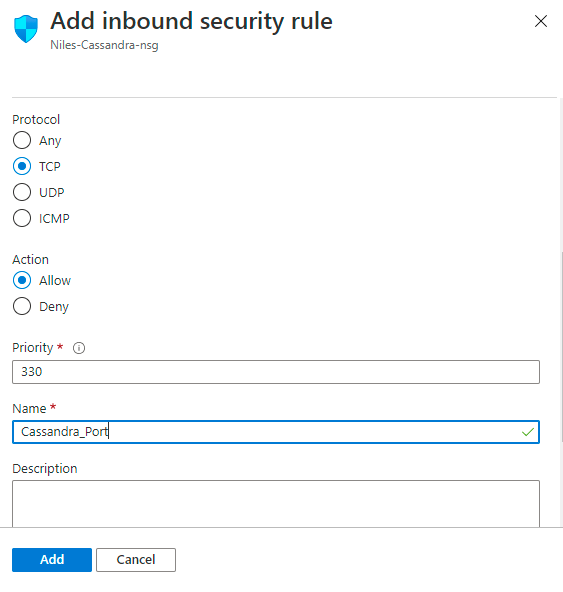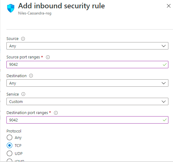 Step 4: Add the Cassandra port (9042) under setting -inbound security rules as shown in below images.