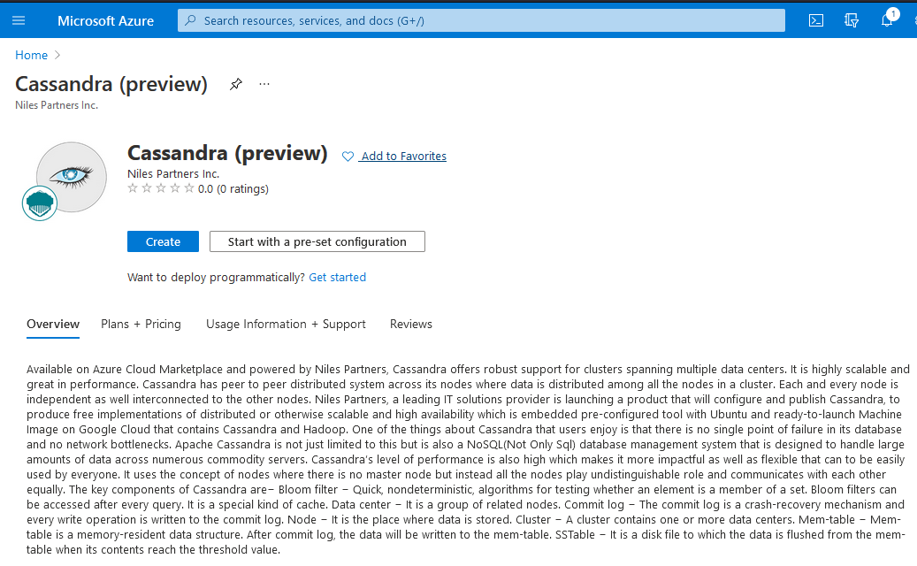 Available on Azure Cloud Marketplace and powered by Niles Partners, Cassandra offers robust support for clusters spanning multiple data centers. It is highly scalable and great in performance. Cassandra has peer to peer distributed system across its nodes where data is distributed among all the nodes in a cluster. Each and every node is independent as well interconnected to the other nodes.