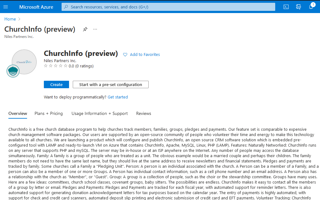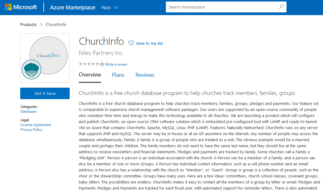 We are launching a product which will configure and publish ChurchInfo, an open source CRM software solution which is embedded pre-configured tool with LAMP and ready-to-launch VM on Azure that contains ChurchInfo, Apache, MySQL, Linux, PHP (LAMP).