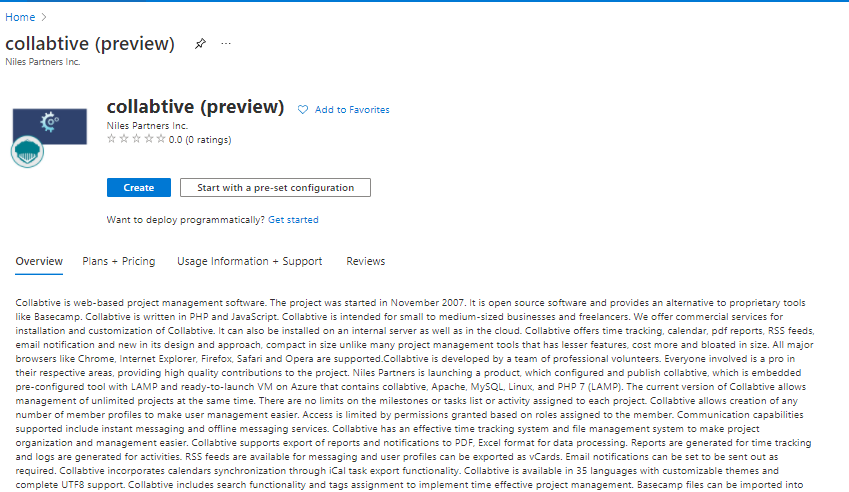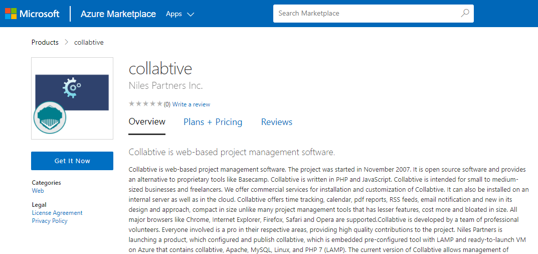 Niles Partners is launching a product, which configured and publish collabtive, which is embedded pre-configured tool with LAMP and ready-to-launch VM on Azure that contains collabtive, Apache, MySQL, Linux, and PHP 7 (LAMP).
