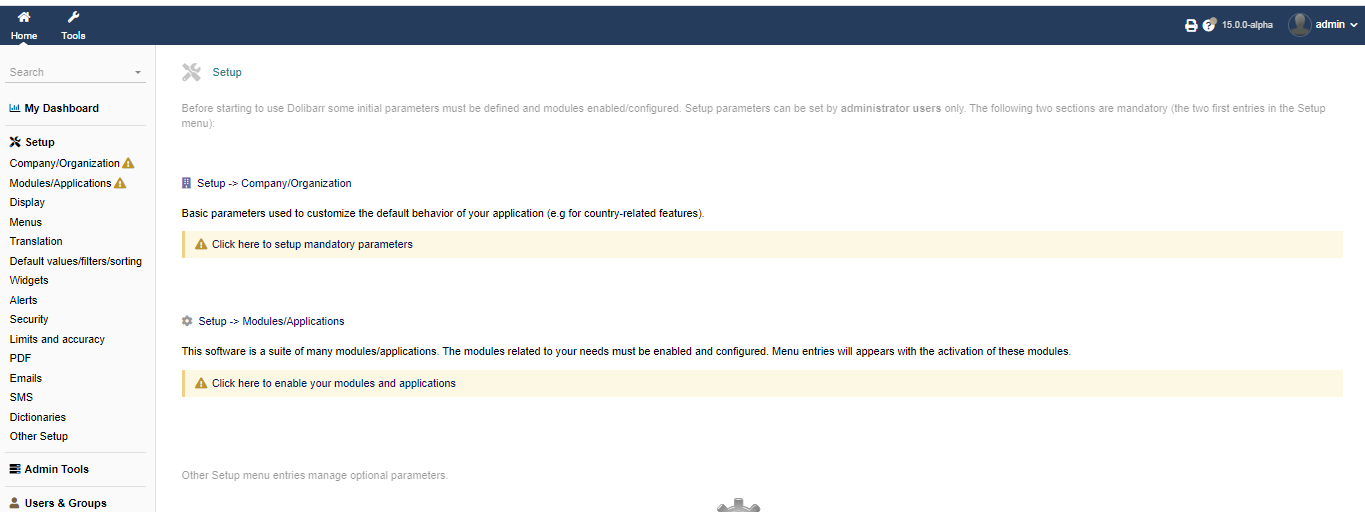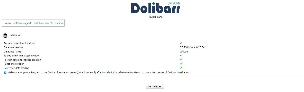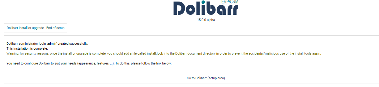Step 8: Congratulation your Dolibarr is installed and ready to be set up and you can click on Go to Dolibarr setup area.