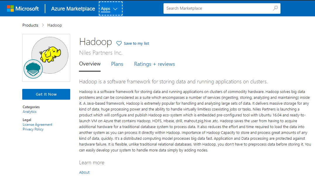 Niles Partners is launching a product which will configure and publish Hadoop eco-system which is embedded pre-configured tool with Ubuntu 16.04 and ready-to-launch VM on Azure that contains Hadoop, HDFS, Hbase, drill, mahout,pig,hive ,etc.