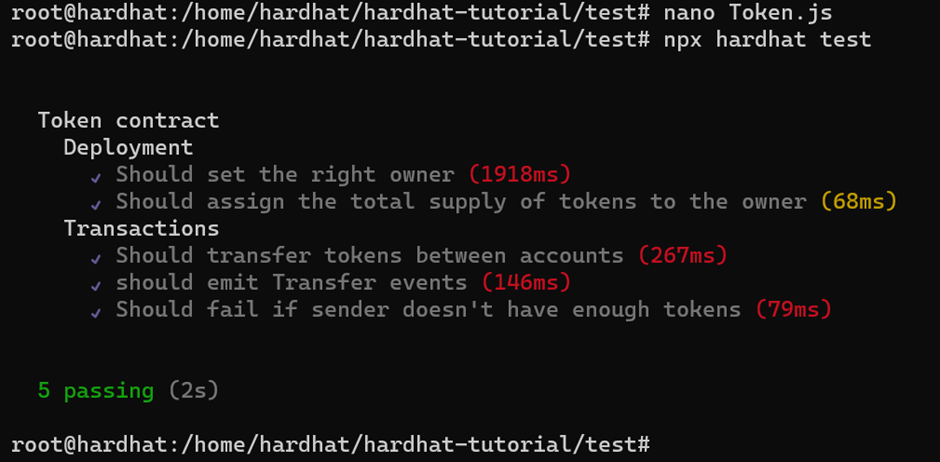 Keep in mind that when you run npx hardhat test, your contracts will be automatically compiled if they’ve changed since the last time you ran your tests.
