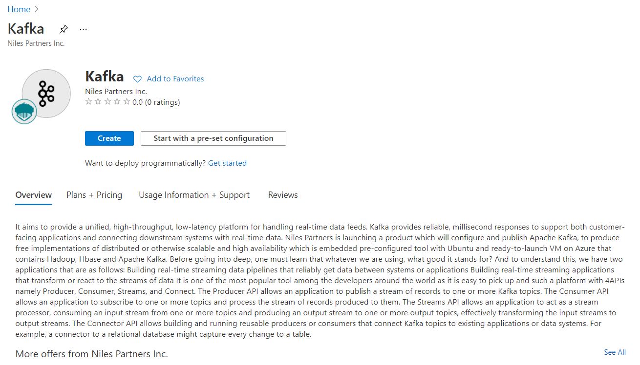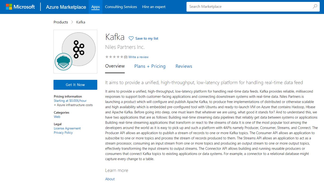 Niles Partners is launching a product which will configure and publish Apache Kafka, to produce free implementations of distributed or otherwise scalable and high availability which is embedded pre-configured tool with Ubuntu and ready-to-launch VM on Azure that contains Hadoop, Hbase and Apache Kafka.