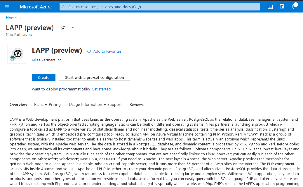 Niles partners is launching a product which will configure a tool called as LAPP to a wide variety of statistical (linear and nonlinear modelling, classical statistical tests, time-series analysis, classification, clustering) and graphical techniques which is embedded pre-configured tool ready-to-launch AMI on Azure Virtual Machine containing PHP, Python, Perl.