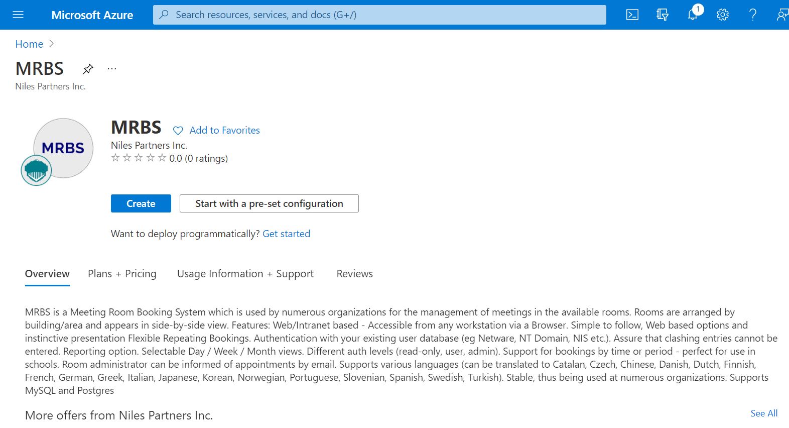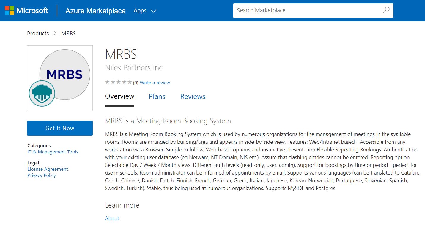 Niles Partners is launching a product which will configure and publish MRBS embedded pre-configured tool with LAMP and ready-to-launch AMI on Azure image that contains MRBS, Apache, MySQL, Linux, PHP (LAMP).