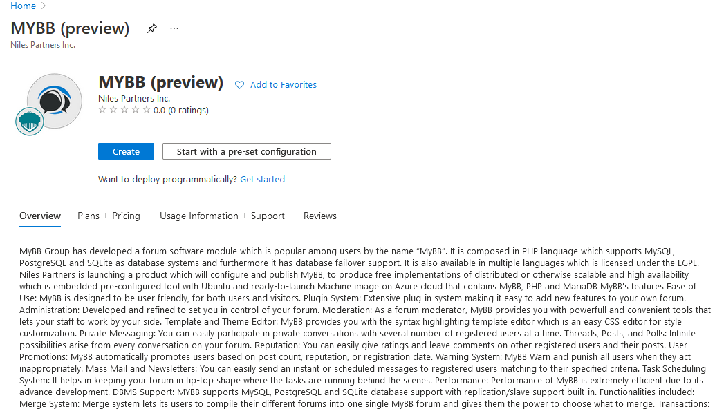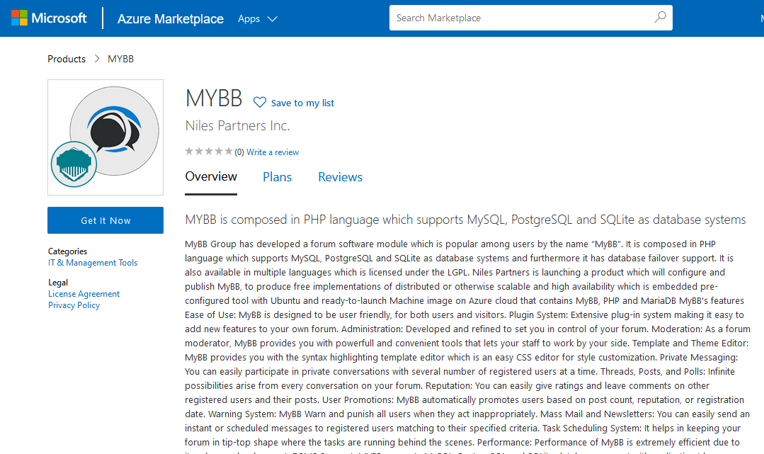 Niles Partners is launching a product which will configure and publish MyBB, to produce free implementations of distributed or otherwise scalable and high availability which is embedded pre-configured tool with Ubuntu and ready-to-launch Machine image on Azure cloud that contains MyBB, PHP and MariaDB