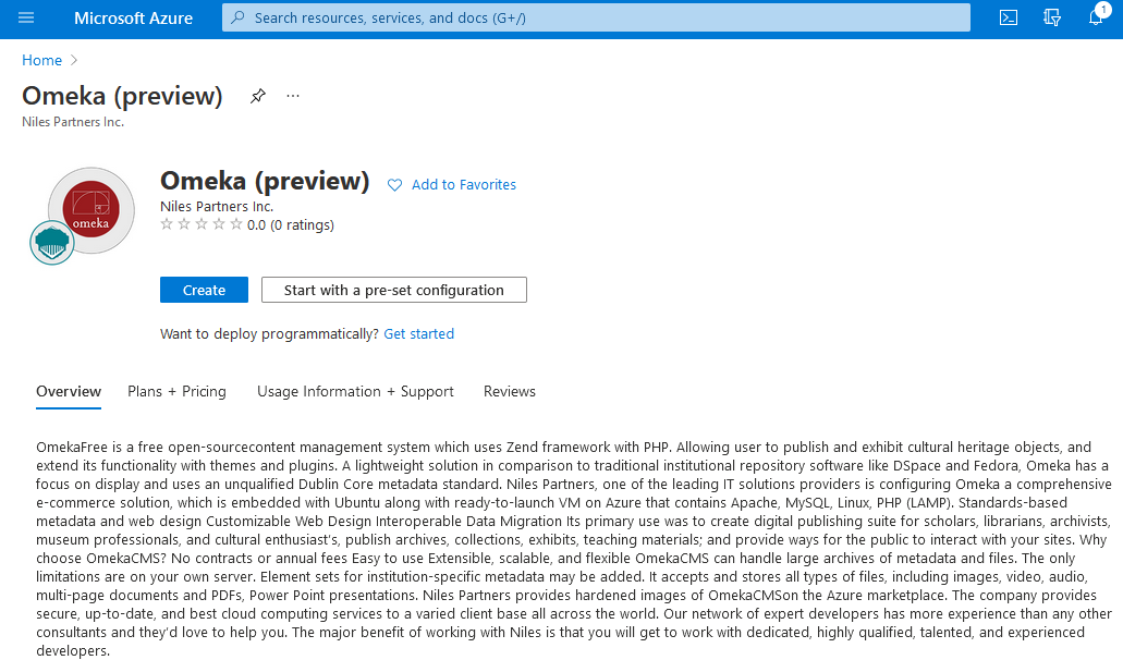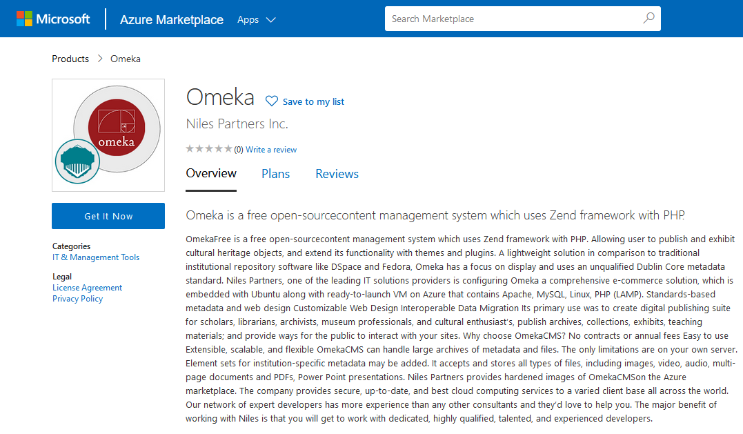 Niles Partners provides hardened images of OmekaCMSon the Azure marketplace. The company provides secure, up-to-date, and best cloud computing services to a varied client base all across the world. Our network of expert developers has more experience than any other consultants and they’d love to help you. The major benefit of working with Niles is that you will get to work with dedicated, highly qualified, talented, and experienced developers.