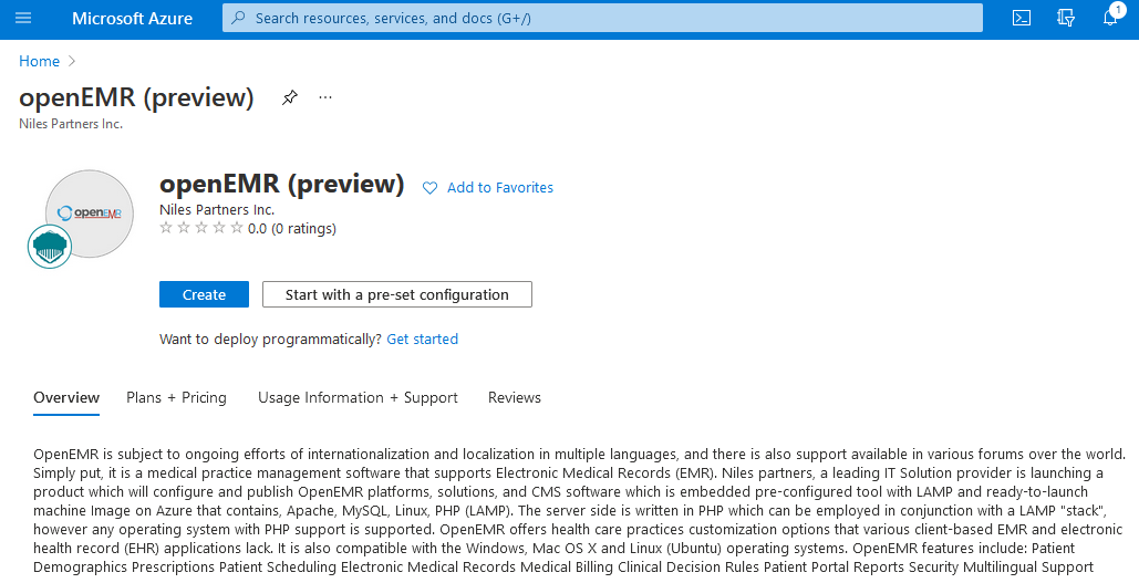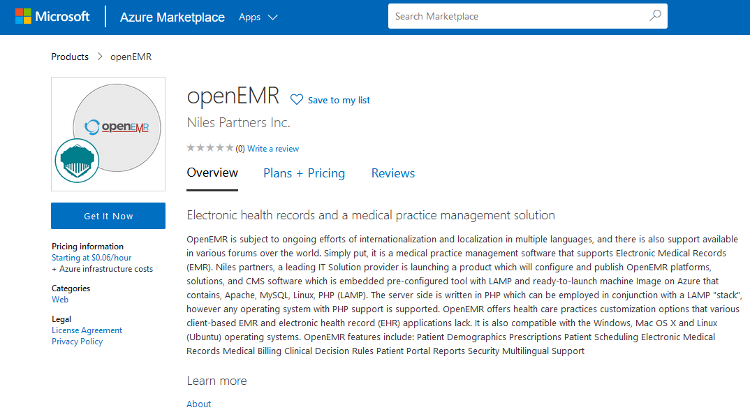 Powered by Niles partners and available on Azure Marketplace, OpenEMR is a popular electronic health records and a medical practice management solution. This EMR software is ONC Complete Ambulatory EHR certified and features fully integrated electronic medical records, electronic billing, scheduling, and practice management for a medical practice.