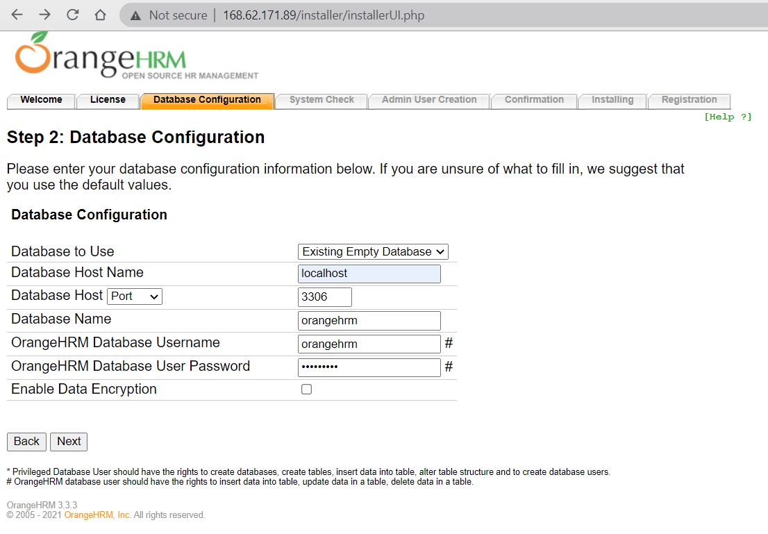 Enter your database configuration information such as Database Host, Database Port, Database Name, Username, and Password. Then click on the “Next” button. You should see the following page.