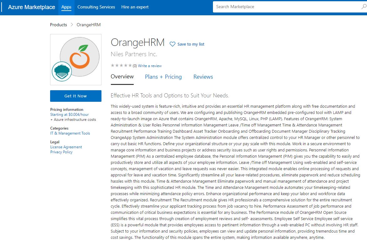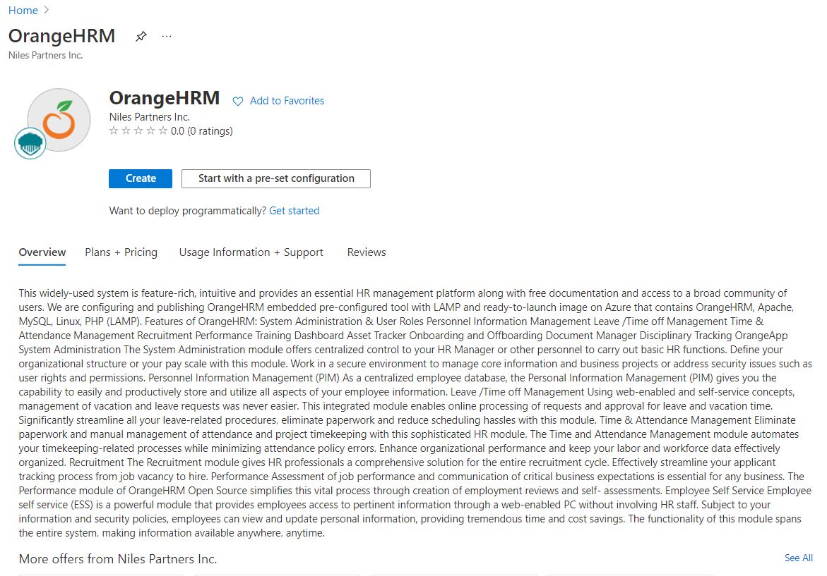 We are configuring and publishing OrangeHRM embedded pre-configured tool with LAMP and ready-to-launch image on Azure that contains OrangeHRM, Apache, MySQL, Linux, PHP (LAMP).