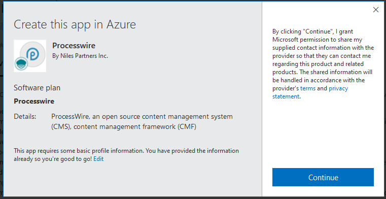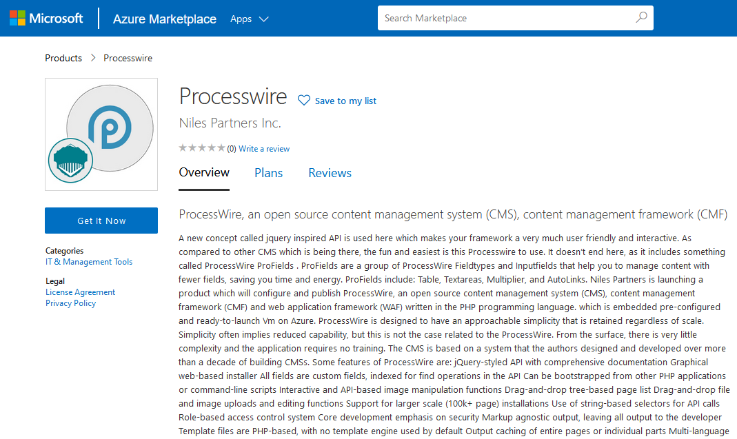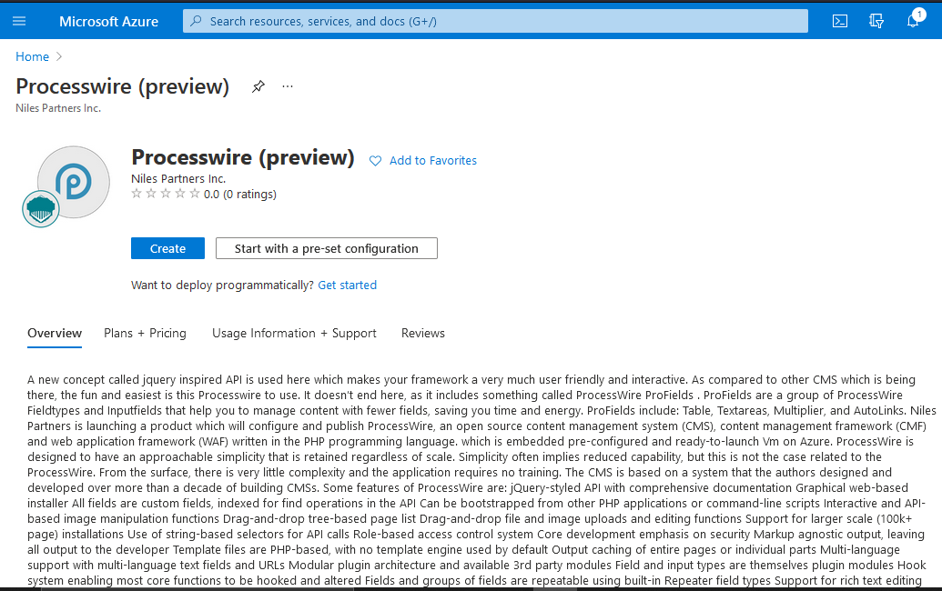 Niles Partners is launching a product which will configure and publish ProcessWire, an open source content management system (CMS), content management framework (CMF) and web application framework (WAF) written in the PHP programming language. which is embedded pre-configured and ready-to-launch Vm on Azure.