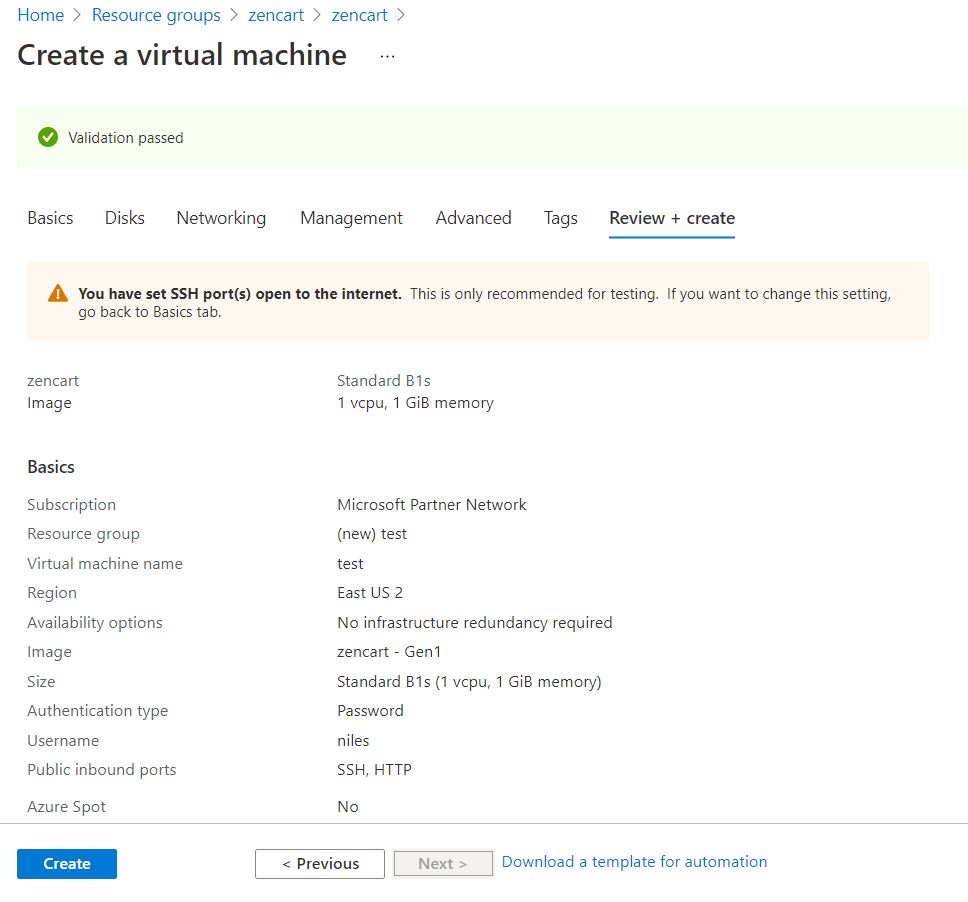 Step 3:The Azure create vm Console confirms that Zencart was deployed when all validations are passed,